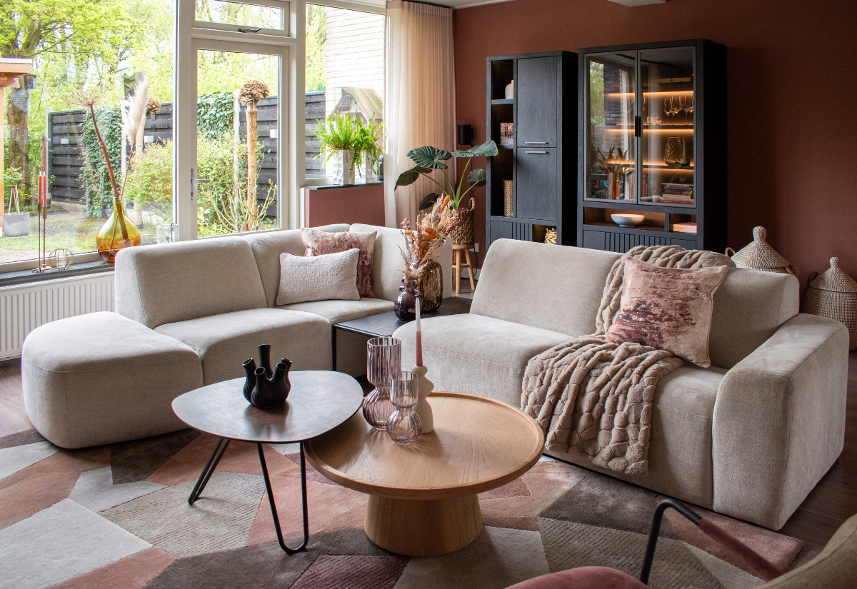 De elegante elementenbank in zachte stof is het hart van de kamer. Met zijn moderne design en afgeronde hoeken creëert deze bank een zachte en minimalistische sfeer in jouw woonkamer. Een combinatie van materialen, zoals hout, textiel en zachte vloerkleden, maakt het geheel helemaal af.