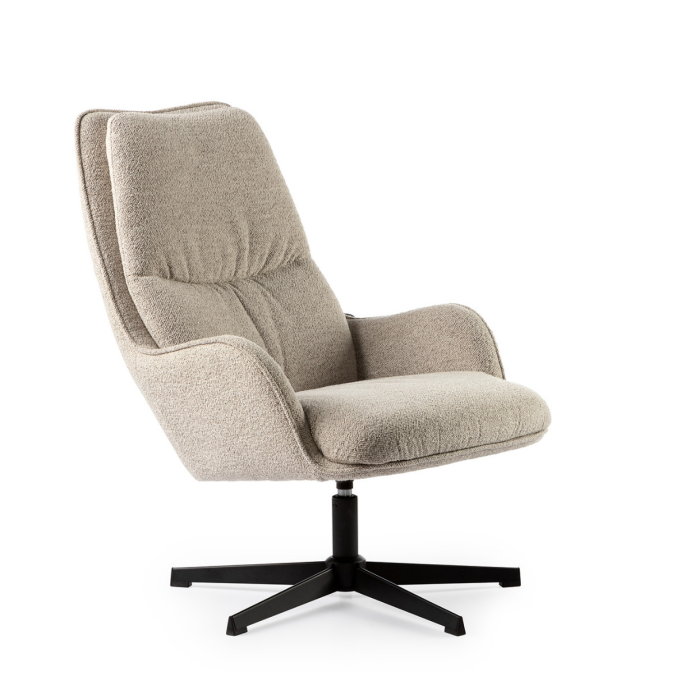 De Delaware draaifauteuil combineert strak design met ultiem comfort. Bekleed met luxe Monza-stof in beige, perfect voor moderne interieurs. De kuipvormige zitting en draaifunctie zorgen voor gemak en ondersteuning.