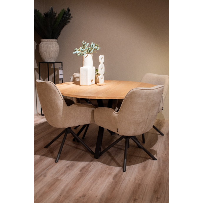 De kleur en de vorm van het tafelblad brengen ongetwijfeld rust in je interieur. Vergeet rechte lijnen, maar ga voor een ronde tafel zonder scherpe hoeken! Een ronde tafel bespaart ook plaats in je interieur. Deze versie heeft een centrale, zwart metalen poot met een uniek design. Het tafelblad heeft een diameter van 140cm.