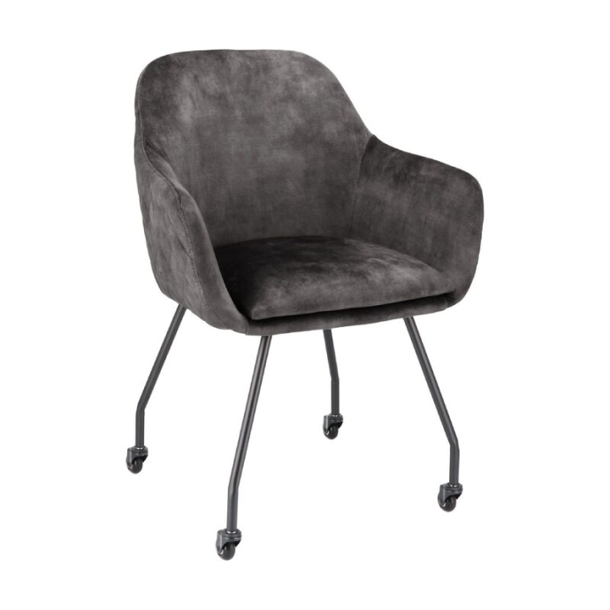 Eetstoel Dioro biedt een heerlijk zacht zitcomfort, door het gebruik van polyetherschuim. Dankzij de fluweelzachte stof adore 67-antracite in combinatie met de zwart metalen poten met skatewielen past deze eetstoel Dioro in vele interieurs. Het stiksel op de achterkant van de rug en zijkant van de armleuningen zorgt voor een rijke uitstraling.