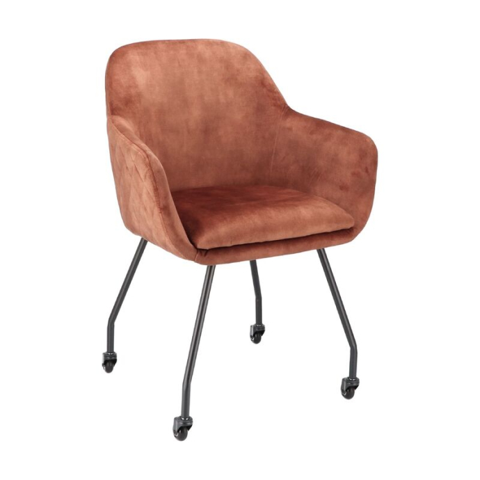 Eetstoel Dioro biedt een heerlijk zacht zitcomfort, door het gebruik van polyetherschuim. Dankzij de fluweelzachte stof adore 126-copper in combinatie met de zwart metalen poten met skatewielen past deze eetstoel Dioro in vele interieurs. Het stiksel op de achterkant van de rug en zijkant van de armleuningen zorgt voor een rijke uitstraling.