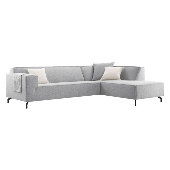 Model Terzo is met zijn strakke vormgeving en moderne zwarte metalen designpoten een echte eyecatcher. Zowel de zitting als de rugleuning zijn vast gestoffeerd en door de gesloten vlindernaad wordt de strakke vormgeving en de kubistische look extra geaccentueerd. Het afwerkingsniveau en het comfort zijn van zeer hoge kwaliteit, zo zijn de beste materialen gebruikt. De hoekbank is gestoffeerd in de prachtige, grof geweven stof Oasis. Dit is een weefstof met verschillende draaddiktes, waardoor een licht reliëf ontstaat. De kleur is een mix van grijze en off white garens. Ondanks de wat grovere weefstructuur voelt de stof erg zacht aan.