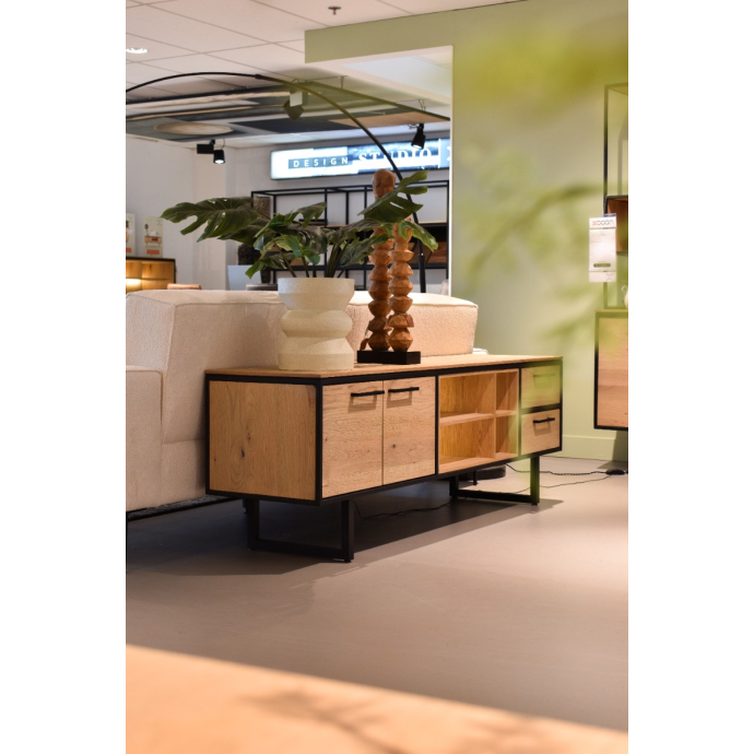 Het lowboard Belo, afkomstig van XOOON, betovert met zijn natuurlijke eikenhouten pracht en vormt een uitstekende keuze als televisiekast. Met een breedte van 180 cm biedt dit lage kastje voldoende ruimte. De zwarte metalen poten en accenten geven het geheel een elegante touch. Dit lage kastje herbergt twee deuren, twee laden en vier met led verlichte vakken, wat het zowel functioneel als stijlvol maakt.