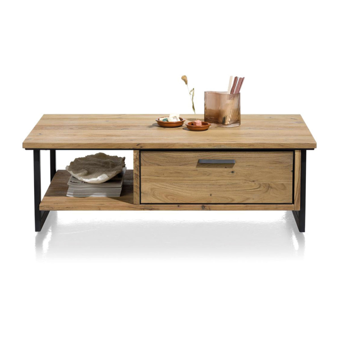 Salontafel Tokyo is een prachtige tafel voor in een modern of industrieel interieur. Het blad is van Kikar hout gelakt wat ondersteunt wordt door een zwart frame wat een stoere uitstraling geeft. Tokyo is voorzien van 1 lade waarin je nog wat spulletjes in kwijt kan, ook heeft de tafel nog een open niche waar je je favoriete tijdschriften in kan leggen.