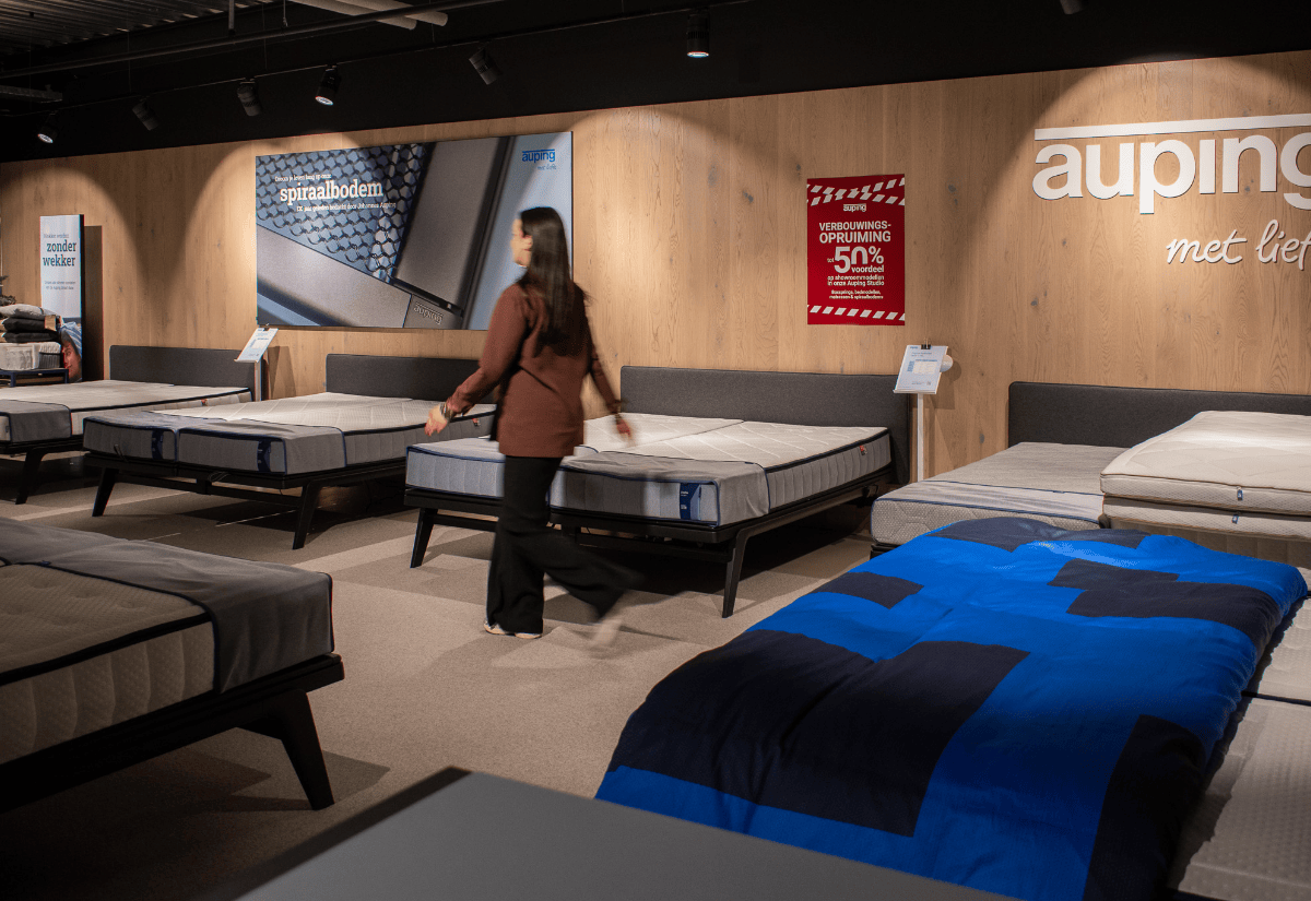 Tijdens de verbouwingsopruiming ben je van harte welkom in onze Auping Studio. In de showroom kun je verschillende boxsprings, matrassen en ledikanten zelf ervaren. We helpen je graag bij het vergelijken van comfort, ondersteuning en ventilatie, zodat je zeker weet dat je de juiste keuze maakt.