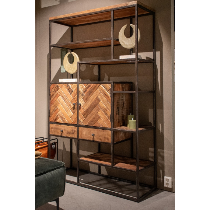 Wandkast Giza kenmerkt zich door zijn stoer en speels karakter. De combinatie van het acaciahout, het metalen frame en het vissengraat patroon geeft de wandkast een eigentijdse en industriële uitstraling. Giza is voorzien van 2 deur, 2 lades en 5 planken waar je gemakkelijk je spullen in kunt opbergen.